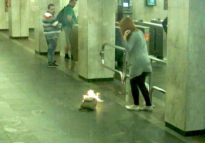 В панике пассажирка бросила рюкзак на пол, а подоспевшие работники метрополитена сумели быстро потушить пламя.