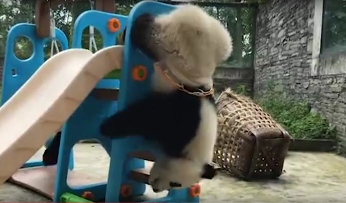 В одном из зоопарков Китая на игровой площадке для бамбуковых мишек одно из животных залезло в баскетбольную корзину и застряло там.